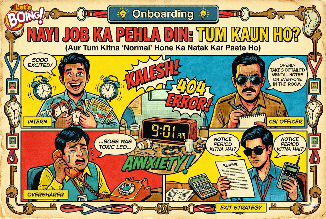 Job ka pehla din. Bhaisaab, yeh din insaan ki aukaat aur acting skills, dono ka test leta hai. Naya office. Naye log. Naya login password (jo tum agle 5 minute mein 4 baar bhool jaoge). Tum sochte ho tum composed rahoge, ekdum alpha entry maaroge, sukoon dikhaoge. Jhooth. Safed jhooth. Pehle din acting band ho jaati hai aur tumhari asli, sadiyon purani anxiety bahar aa jaati hai. Aao dekhte hain uss naye ID card ke piche asli kalesh kaunsa hai.