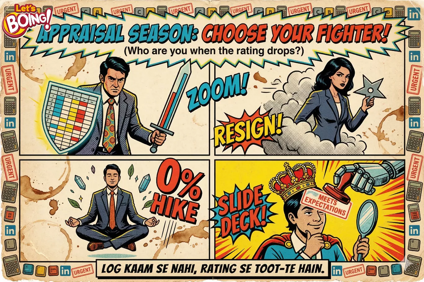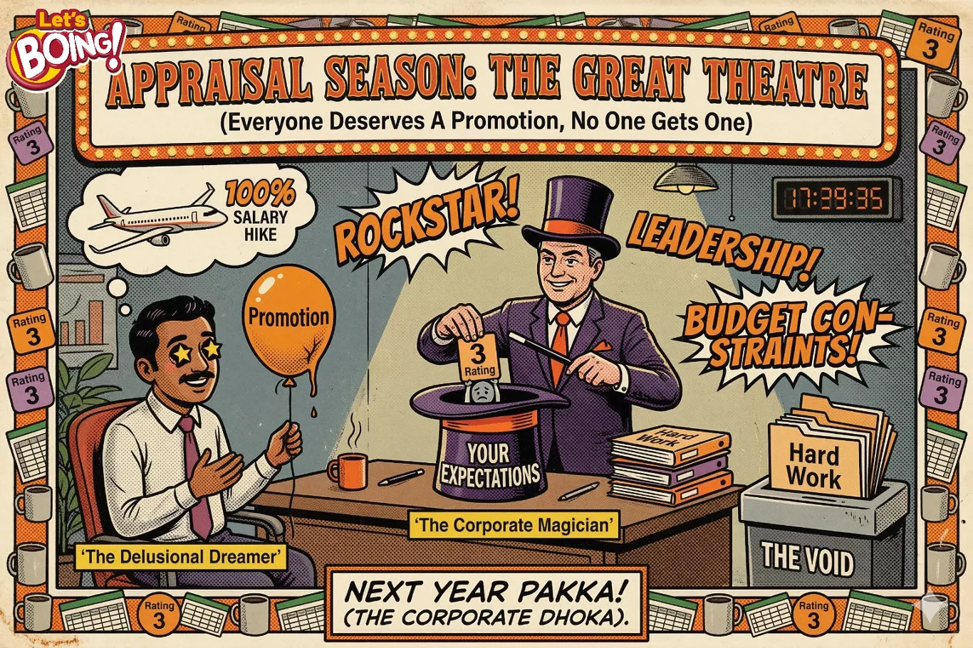 APPRAISAL SEASON koi business process nahi hai doston. Yeh ek national level ka theatre hai. March aate hi office ki hawa mein ek ajeeb sa 'stress' aur 'fake excitement' ghul jaata hai. Cafeteria mein log aise milte hain jaise kal hi unki lottery lagne wali ho, par andar hi andar sabko pata hai ki Rating toh wahi milegi jo HR ne 3 mahine pehle hi Excel mein lock kar di hai.