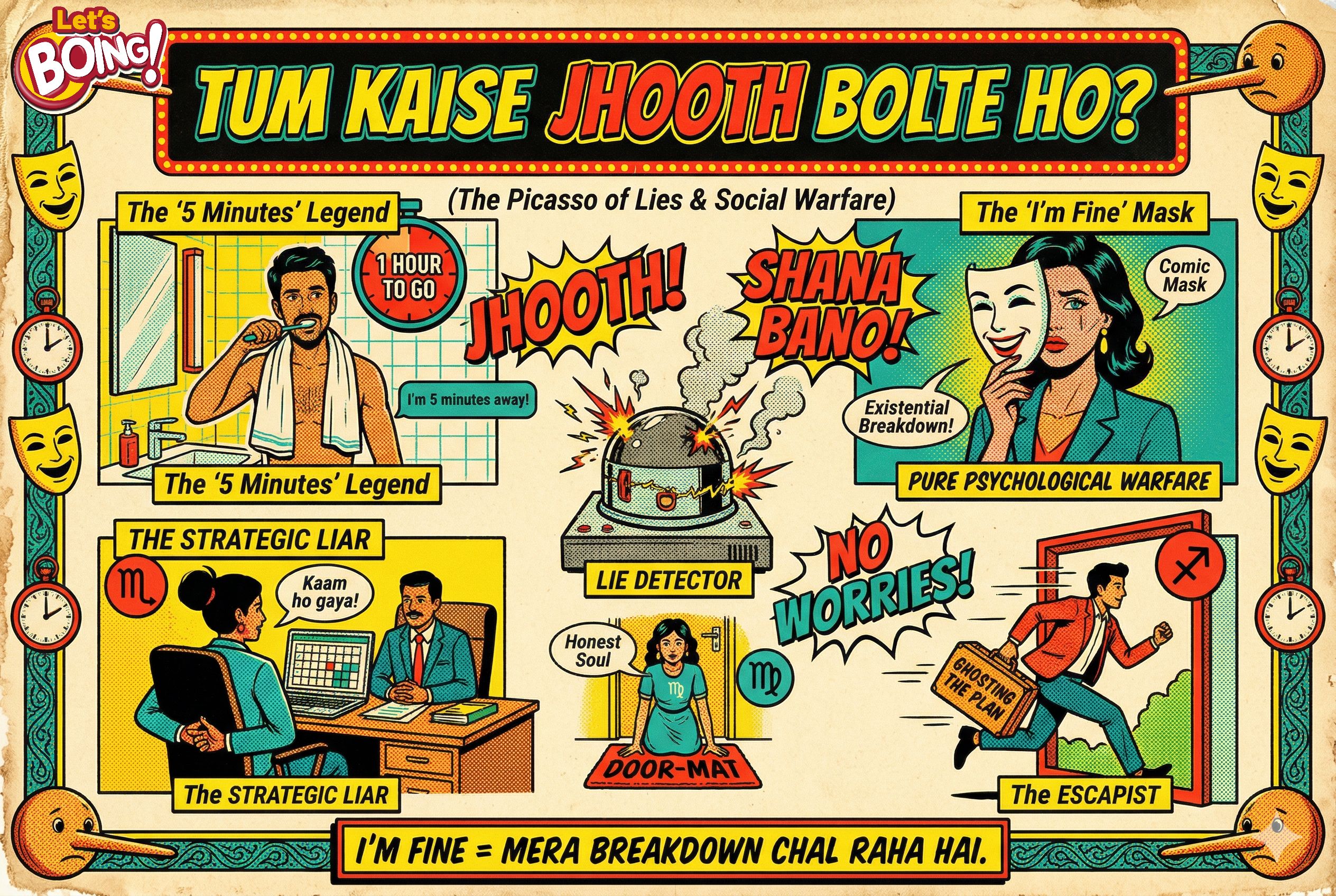 AAO BAITHO. Aaj thoda imandaari se baat karte hain ki hum kitne bade jhoothe hain. Log bolte hain, "Bhai, main kabhi jhooth nahi bolta"—bas, wahi tumhara pehla aur sabse bada jhooth hai. Hum sab ek aisi delusional duniya mein jee rahe hain jahan "I'm 5 minutes away" ka matlab hota hai "Main abhi naha raha hoon," aur "I’m fine" ka matlab hai "Mera mental breakdown chal raha hai". Jhooth bolna ek art hai, aur hum sab iske Picasso ban chuke hain. Farq sirf itna hai ki tumhara jhooth 'Social Nicety' hai ya 'Pure Psychological Warfare'?