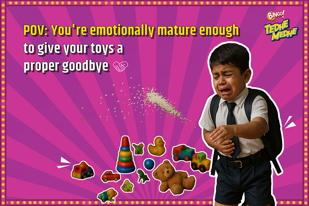 Sach mein yaar, har Indian bachche ka yahi haal hota hai. Vacation mode is still on, but school uniform is already out. Toys ki vidai karna is basically accepting that fun time is over and ab sirf books, homework, aur "beta padhai karo" sunna hai. This little guy just made it official with a full ceremony. Respect for the dedication, honestly.