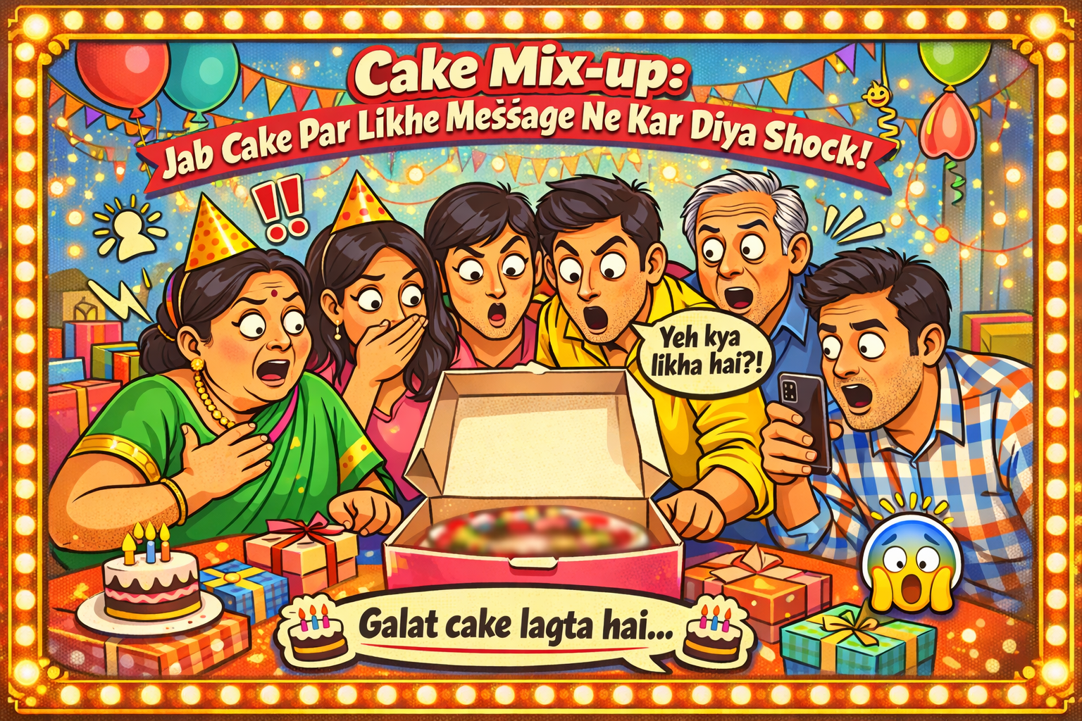 Aur realise hua — nahi bhai, cake ke upar hi likha hai.