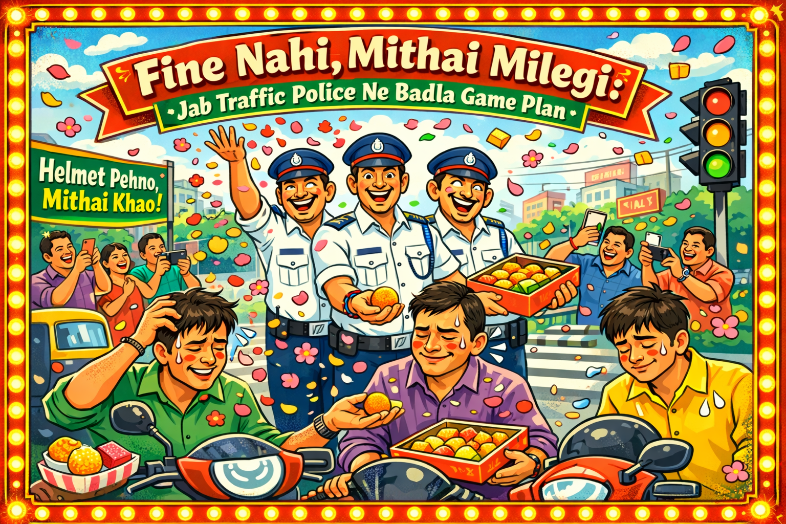 - Message tha: “Helmet pehno, warna next time sirf phool nahi milega”